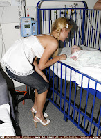 Paris Hilton and Kim Kardashian opened their ho hearts enough to visit the Royal North Shore Childrens Hospital in Sydney. By visit I mean pose next to sick kids without touching them or showing them any kind of affection. Paris also signed autographs outside and posed with fans. She’s posting next to that poor baby like it’s a tourist attraction. You know she’s grossed out, but that baby is grossed out more.